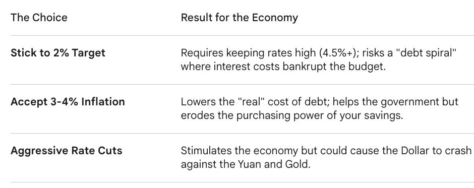 “Opportunistic Disinflation”: Analysts believe the Fed may move toward a policy where they “accept” 3% inflation for several years. By allowing prices to rise slightly faster, the government effectively “inflates away” the real value of its $39 trillion debt, making those massive interest payments easier to manage.