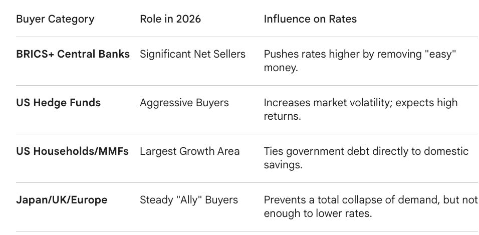 When BRICS+ nations (like Saudi Arabia, the UAE, and China) reduce their “recycling” of oil profits into US Treasuries, a new set of buyers has had to step in. Here is the breakdown of who is currently picking up the slack and the cost to the US taxpayer.
