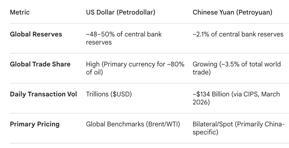In 2026, the global energy landscape is currently at a volatile “inflection point.” While the Petrodollar remains the dominant global standard, the Petroyuan is rapidly transitioning from a theoretical threat to a functional alternative, accelerated by the 2026 conflict in the Persian Gulf.