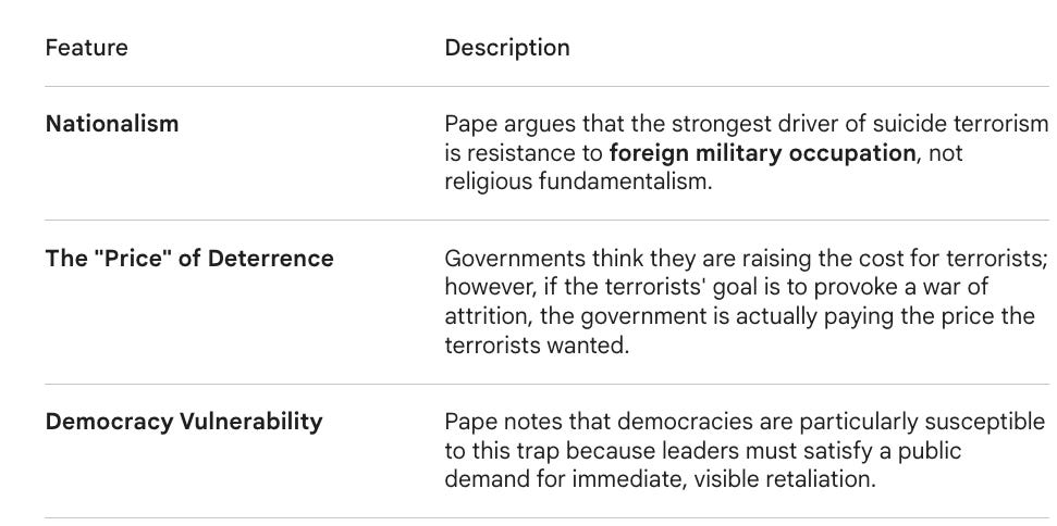 Pape’s work, particularly in Dying to Win: The Strategic Logic of Suicide Terrorism, suggests that terrorists use violence to provoke a heavy-handed state reaction, which then serves their long-term political goals.